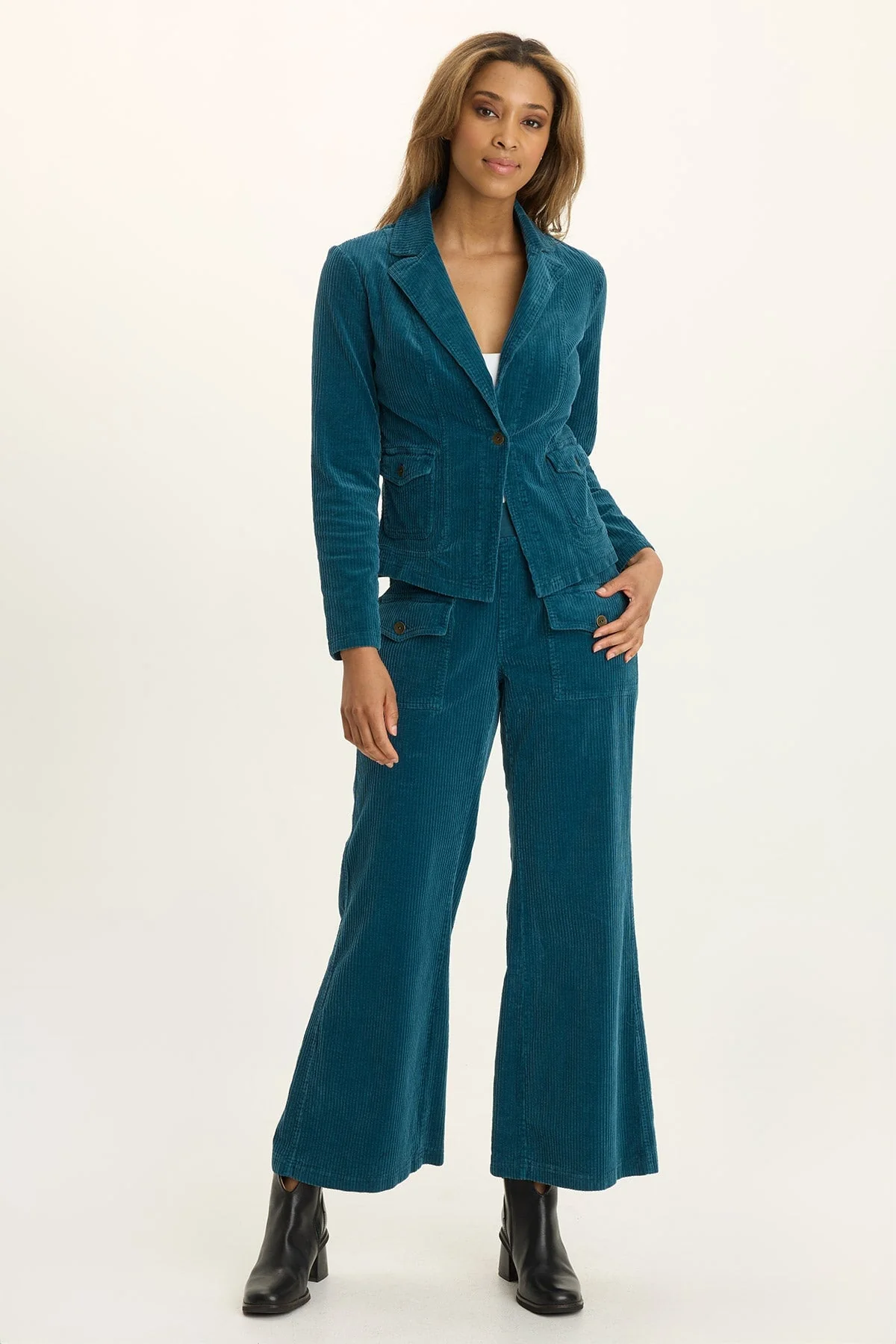 A single button closure creates a subtly contoured silhouette on this corduroy blazer. A split collar and envelope pockets on either side complete this casual yet polished style.
