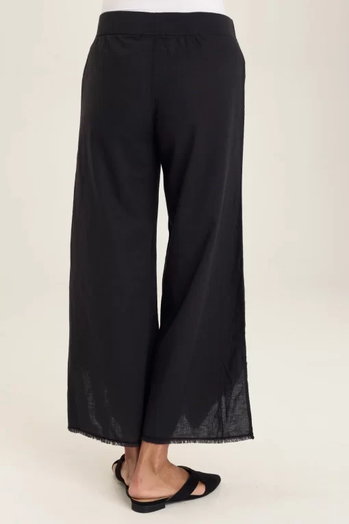 Our favorite wide leg pant in a slightly modified fabric for a less wrinkled look. This one features a linen/cotton blend body with an elastic pull-on waistband, wide leg, and an asymmetric handkerchief hemline with raw edges.