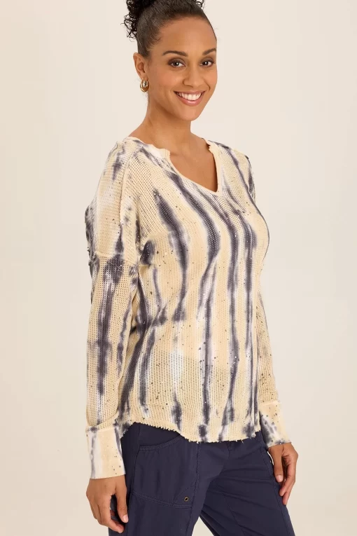 An exaggerated V-neck teams up with a drop shoulder look in our latest sweatshirt-like pullover. An airy mesh and rib details make Bullock oh-so-comfy and classy!