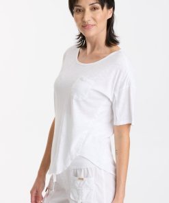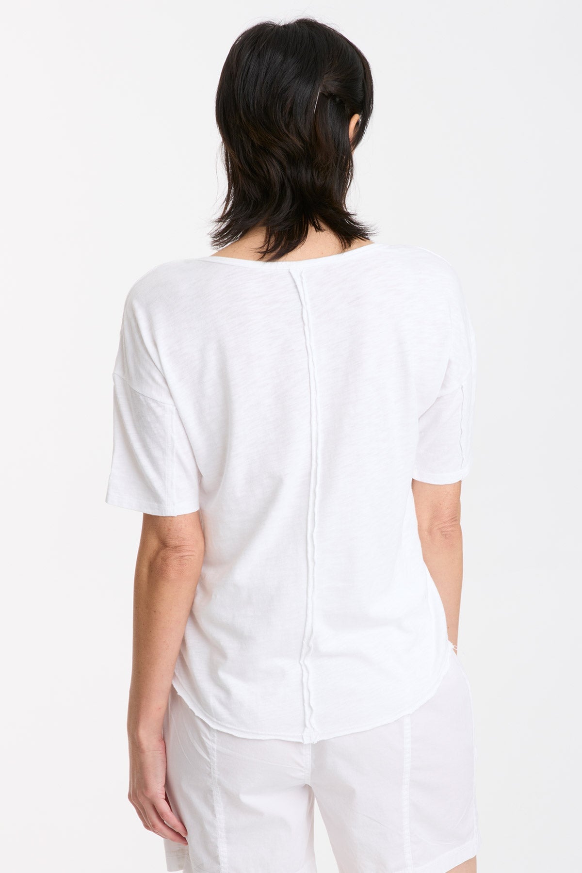 In our soft Effie Slub Jersey, Duvall features a high-low hem, crew-neck cut, forward pitched seams, raw-edge detailing throughout, and a patch pocket in front for an upgraded go-to tee.