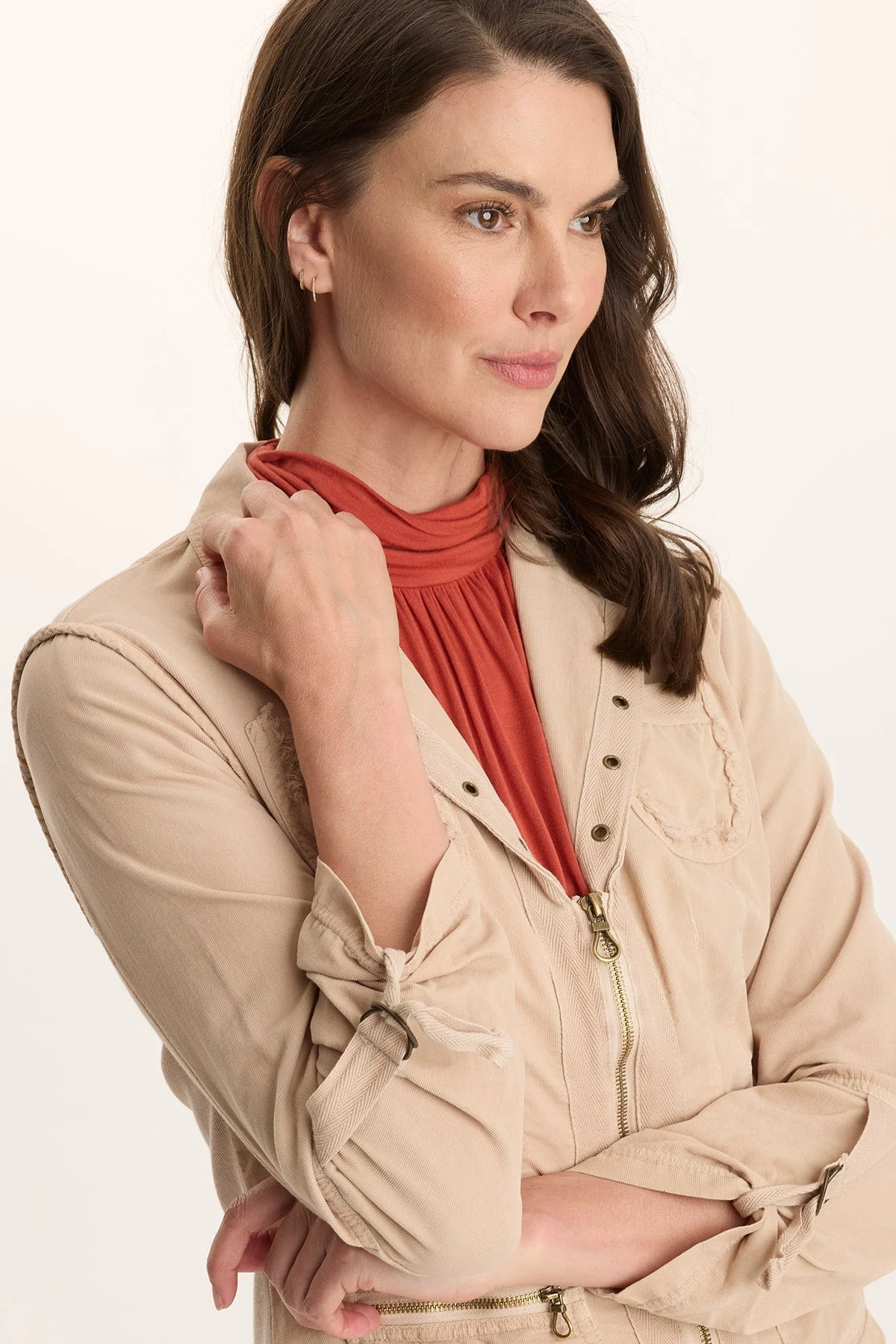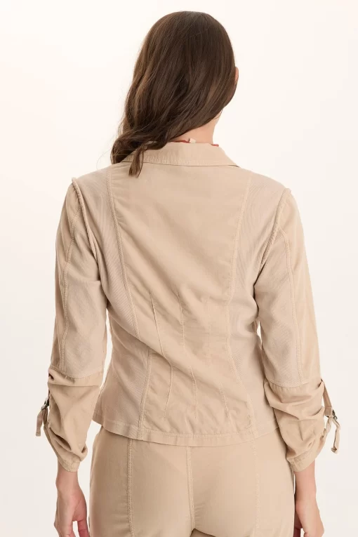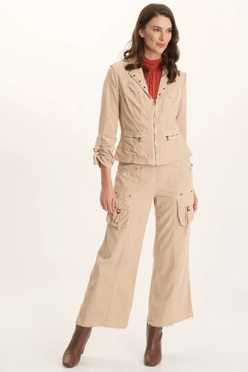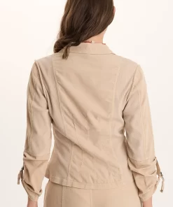 Details details details! Tabbed ruched sleeves, breast pockets, zippered pockets on either side, and eyelet hardware detail on the split collar maximize the star power of this cotton cord zip-up jacket. With a lightly contoured fit, Eino is great for lightweight layering or worn on its own as an eye-catching, unexpected top.