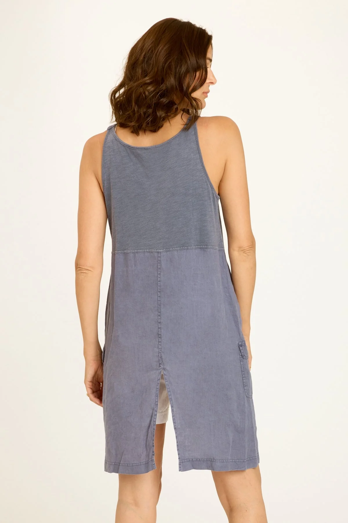Unique as can be. In contrasting jersey and linen, Finton’s elongated side panels add some unexpected coverage and feature pockets for additional function. Adjustable antique brass hardware-buckled straps and rib at the front hem take things up a notch in this tunic-esque, novelty style.