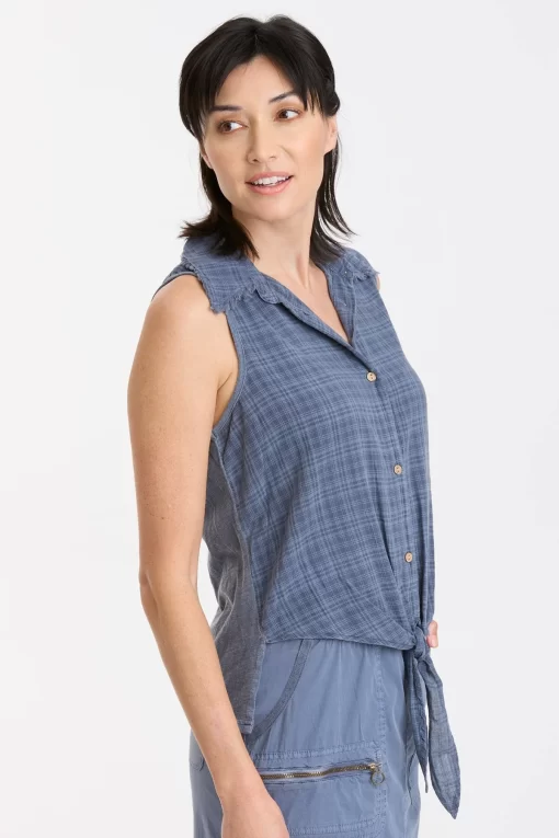 With a cheeky tie-front hem, contrasting jersey back panels, raw-edge collar details, coconut buttons, and a high-low hem, the Fleming Tie Tank is a showstopper in Tarley Plaid Voile.