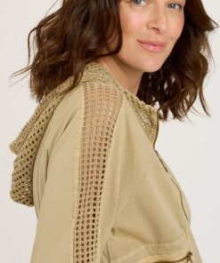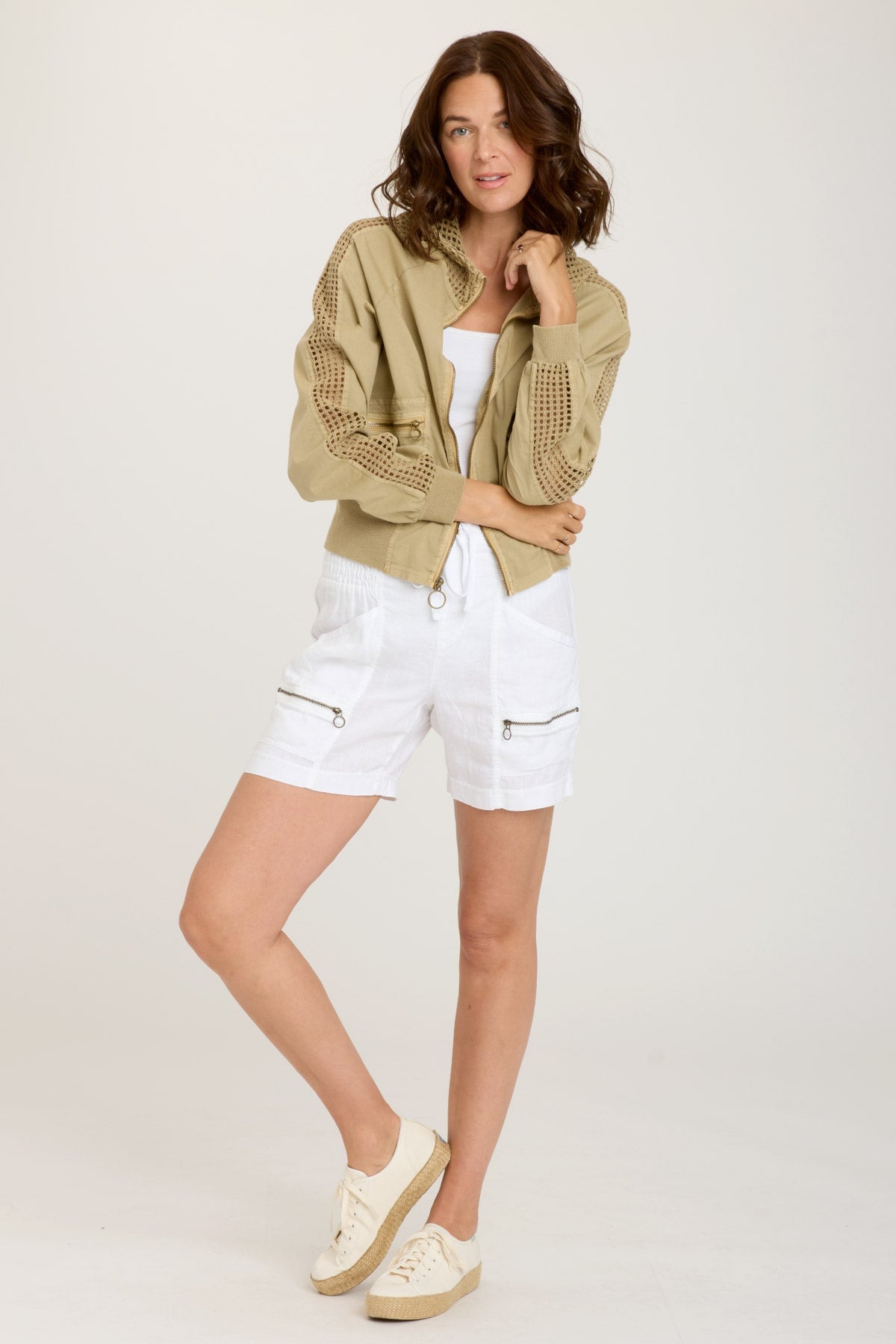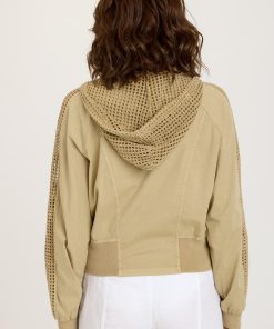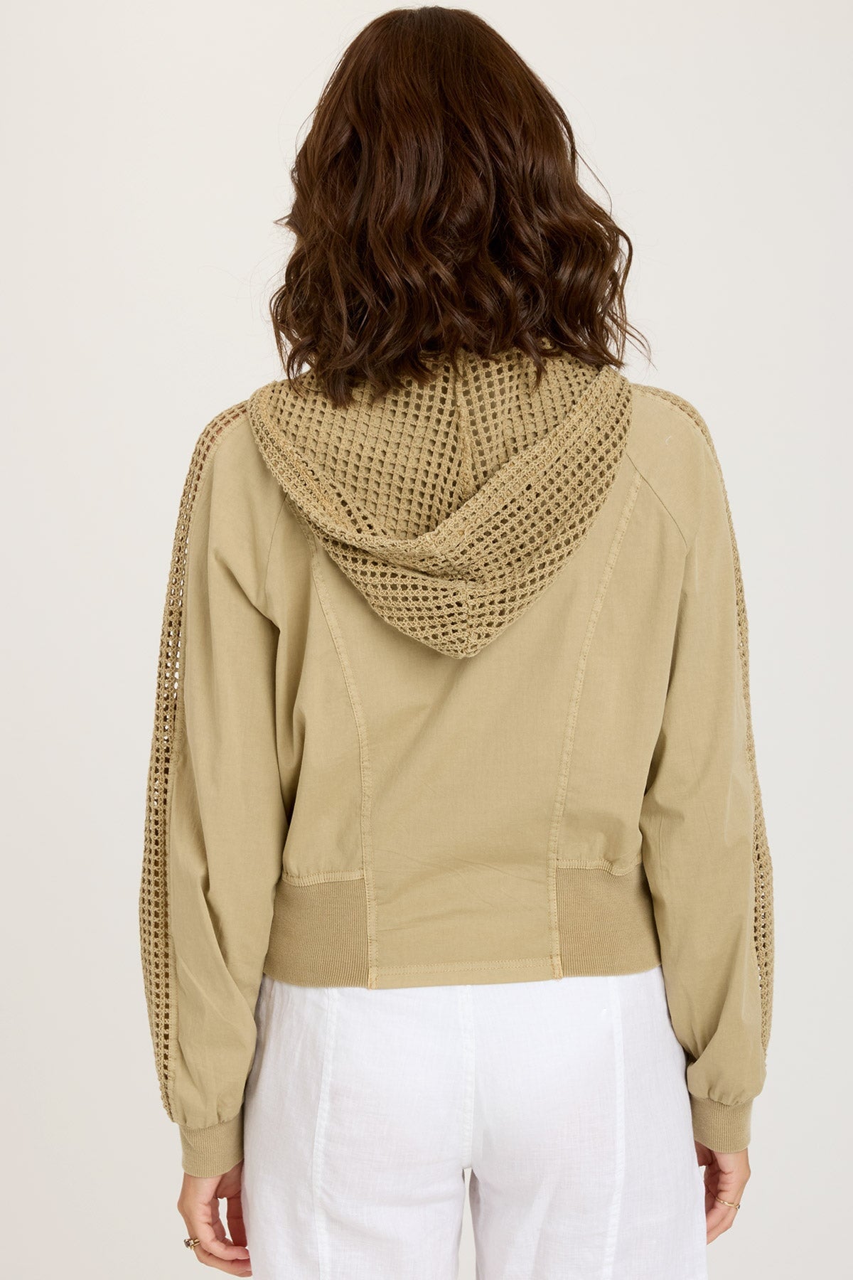 A mesh strip down the length of Gillian’s sleeve and matching mesh hood bring on the unexpected detail in this poplin bomber style with a semi-cropped fit. Diagonal antique brass zippered pockets sit on either side, while ribbed cuffs and a banded hem top it all off.