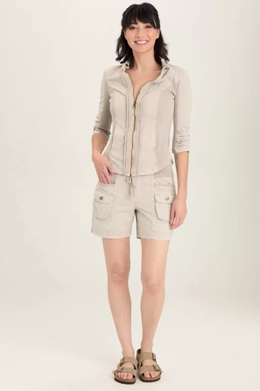 SheÕs back! A stylish, elevated, track jacket-inspired piece of lightweight outerwear, Janet is all for you! Featuring a stand collar with button details, rib inserts at the sides and at the 3/4 sleeves for an impeccable and comfortable fit, twill details at the zipper front, two front in-seam pockets, and ruching on the sleeves and back, Janet is as full of details as she is life!
