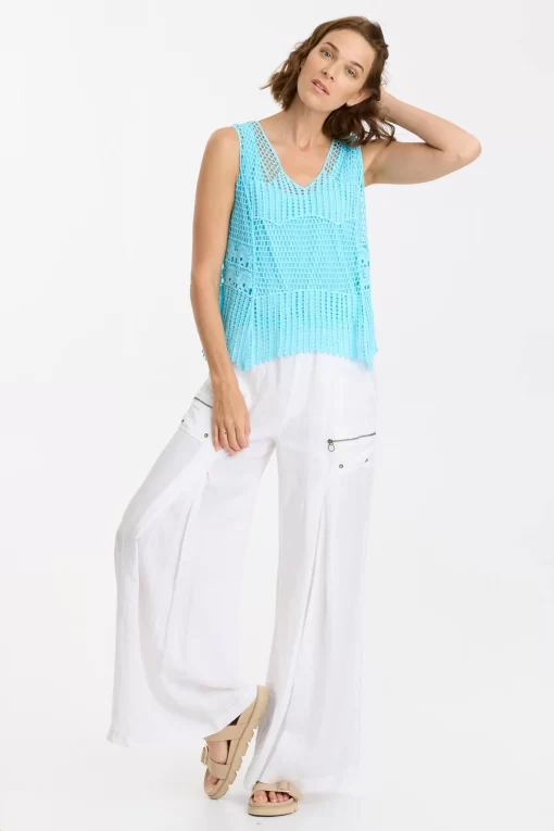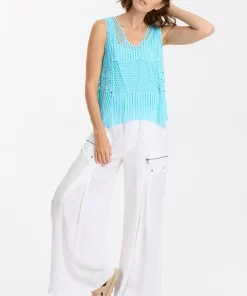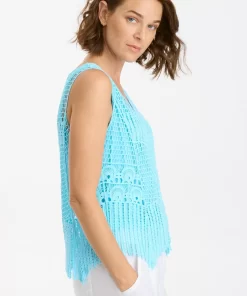 A cotton crochet tank with scalloping and mesh paneling, attached jersey lining, and a v-neck with a sharkbite-esque hem.