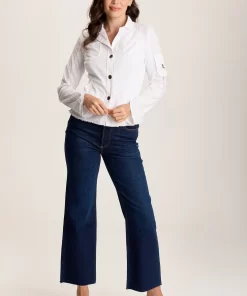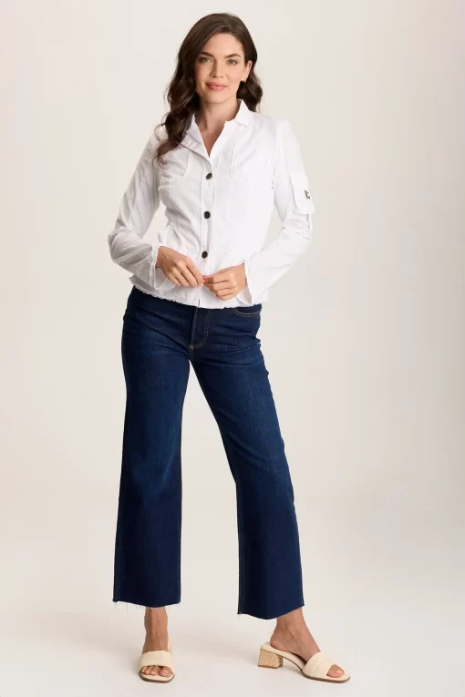 A sharp lapel, three-button design with breast pockets, antique brass detailed pockets, and raw-edge hem bring on the unexpected. A lightly curved silhouette and pointed wrist cuffs top it all off on this subtly cropped, blazer-inspired jacket.