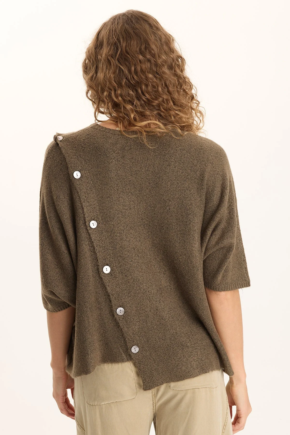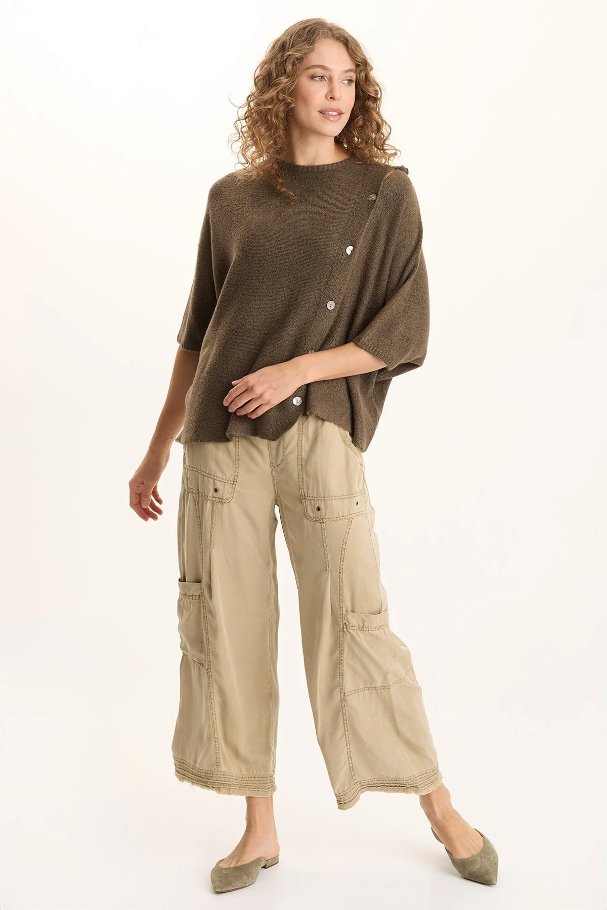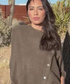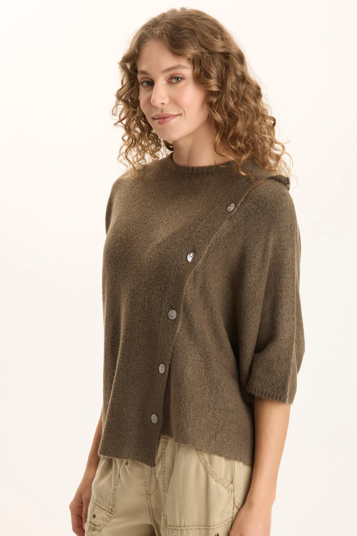 Diagonal buttons create a unique layered look with this poncho worn as a top slightly off the shoulder. Mid-length sleeves and our soft Mirelli Knit make Osiris a go-to for layering.