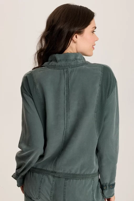 A voluminous collar with corded adjustable ruched channels, a three-brass button closure, and zippered pockets make this relaxed-fit twill style a visual feast!