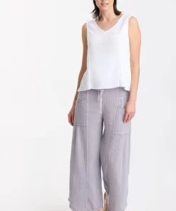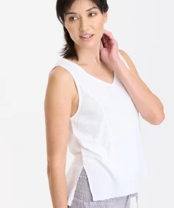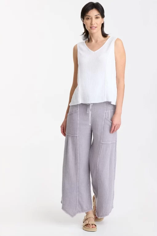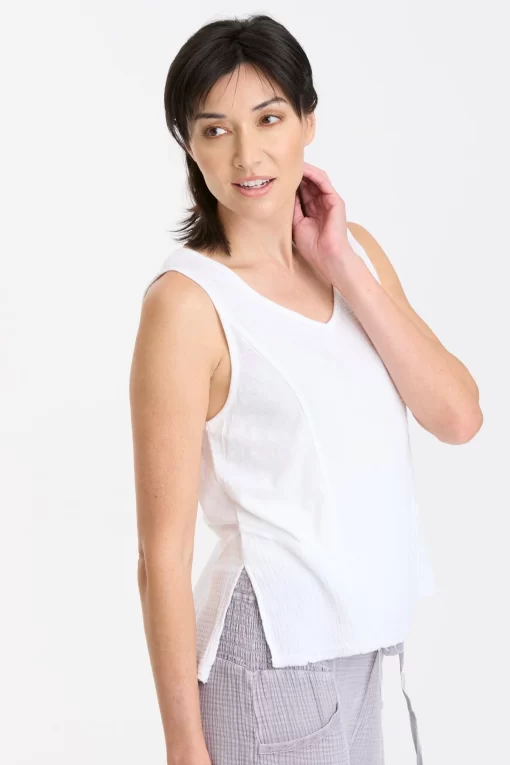 In plush Double Gauze, this v-neck tank features bra-friendly straps, contrasting jersey panels, a raw-edge hem, and side-seam splits for some extra pizzazz.