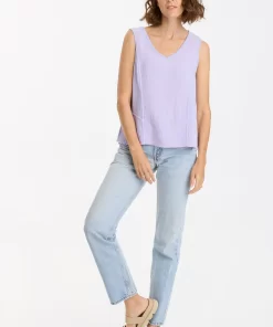 In plush Double Gauze, this v-neck tank features bra-friendly straps, contrasting jersey panels, a raw-edge hem, and side-seam splits for some extra pizzazz.