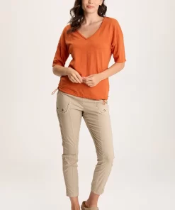 Banded elbow-length sleeves, a v-neck cut and adjustable corded hem bring a touch of the unexpected to this jersey top.