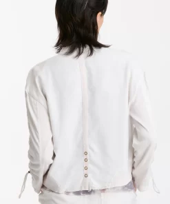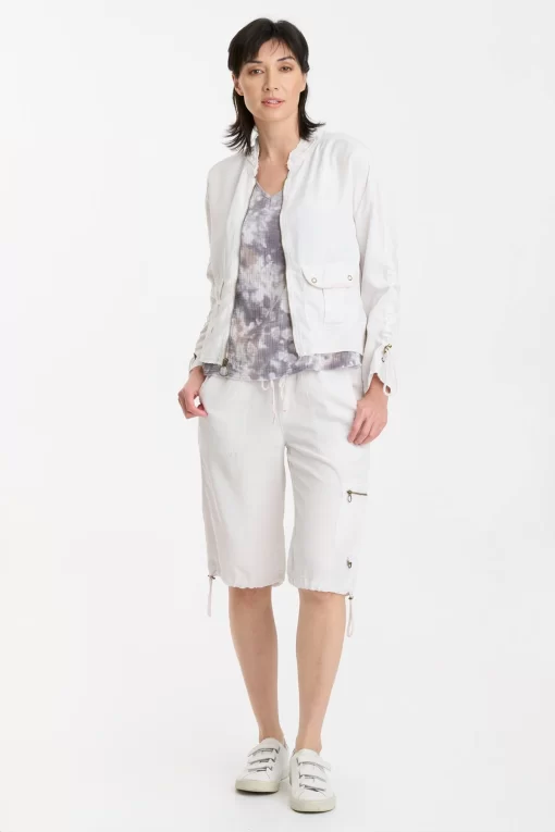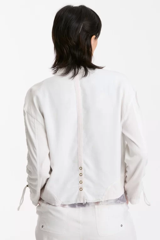 Cinchable corded sleeves with antique brass stoppers bring the adjustable novelty to this Soft Twill varsity jacket. Raw edges at the collar and hem, pleated cargo pockets, a ring-pull zipper, functional back placket, twill tape detailing, and contrasting ribbed collar, side hem, and under-sleeve finish off this unique piece of lightweight outerwear.