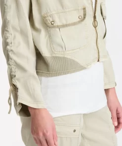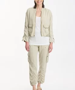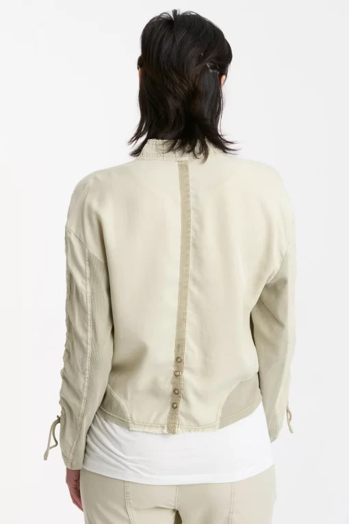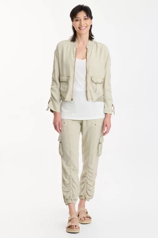 Cinchable corded sleeves with antique brass stoppers bring the adjustable novelty to this Soft Twill varsity jacket. Raw edges at the collar and hem, pleated cargo pockets, a ring-pull zipper, functional back placket, twill tape detailing, and contrasting ribbed collar, side hem, and under-sleeve finish off this unique piece of lightweight outerwear.