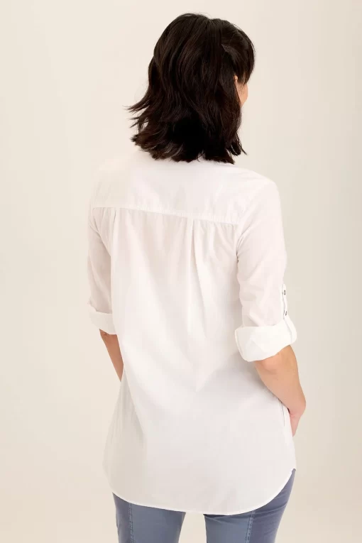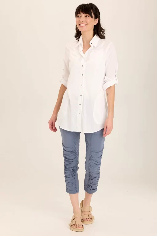 A classic XCVI body brought back to delight with a long tunic style silhouette and a snap-up front closure. Featuring rollable tabbed sleeves, two welt breast pockets and a yoked back pleated panel.