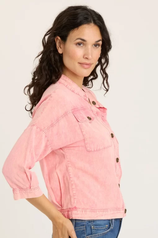 Now available in Taissa Twill, Colbert offers lightweight outerwear with a high collar, and buttons down the center and at the flapped breast pockets. A slightly boxy fit and three-quarter sleeves finish off this clean, classy look.