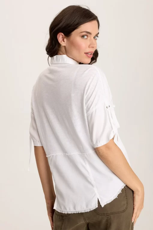 A soft twill tabbed short-sleeve blouse featuring raw edges at the hem and breast pockets, with antique brass snaps and a classic collar. Wear it layered and open, or snapped all the way up; either way, Vinton is the perfect fit for you!